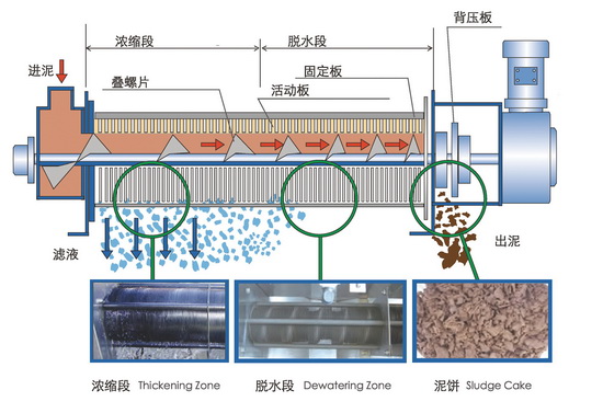污泥在濃縮部經(jīng)過重力濃縮后,被運輸?shù)矫撍?,在前進的過程中隨著濾縫及螺距的逐漸變小,以及背壓板的阻擋作用下,產(chǎn)生內(nèi)壓,容積不斷縮小,達到充分脫水的目的。