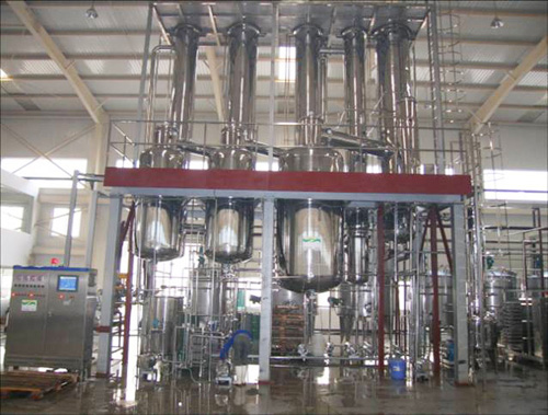 各效蒸發(fā)器、各效分離器、冷凝器、熱壓泵、真空及排水系統(tǒng)、各效料液輸送泵、操作平臺、電器儀表控制柜及閥門、管路等系統(tǒng)組成。